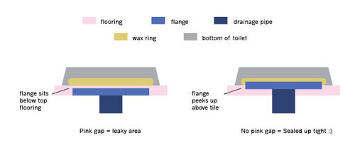 a toilet flange basically affixes your toilet to the floor/plumbing. In order for a toilet to properly form a seal with the wax ring underneath it, the flange needs to sit above the surface of the floor by around ¼ inch. That seal is what keeps your nasty toilet water from making its way between the layers of flooring and subflooring. In a worst-case scenario that water eventually makes its way into another room. Yuck. To help you visualize the difference between a toilet flange set too low and one set correctly, I’ve made a quick diagram, below.