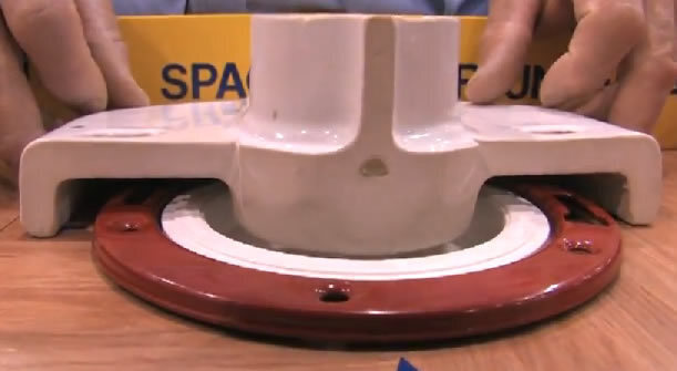 Notice in this image how the toilet waste pipe sits just inside the flange opening, this is the proper way for a toilet to sit on a flange. Even without a wax ring, this union is not likely to leak under normal circumstances.